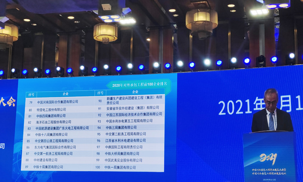 會議期間,中國對外承包工程商會發布了2020年度對外承包工程前100企業,交通、電力、房建三個主要業務領域以及亞洲、非洲、歐洲、拉美四個市場30強名單。其中,我公司位列2020年度對外承包工程前100強企業榜單。此外,公司再次連續獲評2021年度對外承包工程行業A級企業稱號。