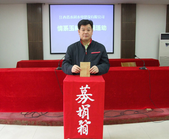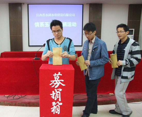 2010年4月14日,青海省玉樹縣發(fā)生兩次地震,最高震級(jí)7.1級(jí),造成了當(dāng)?shù)鼐薮蟮娜松韨龊拓?cái)產(chǎn)損失,“玉樹地震”牽動(dòng)著億萬(wàn)人民的心,也牽動(dòng)著我司所有員工的心!公司在全司范圍內(nèi)積極開展“情系玉樹募捐活動(dòng)”,4月26日,我公司南昌市機(jī)關(guān)總部首先開展了“情系玉樹募捐活動(dòng)”,公司中層以上管理人員和員工踴躍參與募捐活動(dòng),紛紛獻(xiàn)上自己的一份愛心,體現(xiàn)出江西水總?cè)说纳鐣?huì)責(zé)任感!同時(shí),各分公司、國(guó)內(nèi)外施工項(xiàng)目部也在開展此項(xiàng)活動(dòng),預(yù)計(jì)此項(xiàng)活動(dòng)將募得資金3萬(wàn)余元。