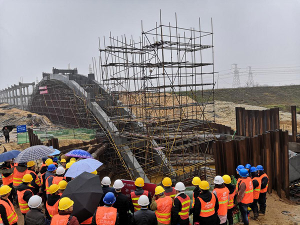 首日,學習團冒著寒風和細雨,先后參觀了西干渠三區地下頂管技術現場、渡王家渡拱式渡槽技術現場,一分干渠曾家渡碗式渡槽完工段。彭燦華、曾俊平、馬小毛等項目管理人員,先后就技術特點、質量安全控制要點、技術方案比選、經濟效益分析等,向學習團一行作了介紹。